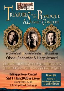 Enjoy world class classical music this weekend with Treasures from the Baroque – intimate House Concert in the stunning Brookvale House in Balingup! Dr Georg Corall, António Carrilho and Michael Brett perform on Oboe, Recorder & Harpsichord